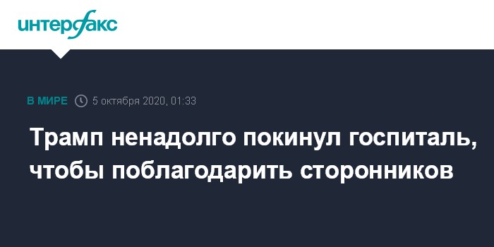 Москва. 5 октября. INTERFAX.RU - Президент США Дональд Трамп, проходящий лечение от коронавируса, ненадолго покинул госпиталь, чтобы поблагодарить своих сторонников, дежурящих у дверей медучреждения.