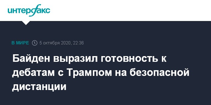 Москва. 5 октября. INTERFAX.RU - Кандидат в президенты США от Демократической партии Джо Байден заявил, что готов к новому раунду дебатов с президентом США Дональдом Трампом, если это будет безопасно, сообщает телеканал CNN.