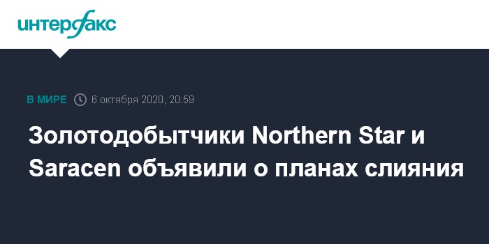Москва. 6 октября. INTERFAX.RU - Австралийские золотодобытчики Northern Star Resources и Saracen Mineral Holdings объявили о планах по слиянию.