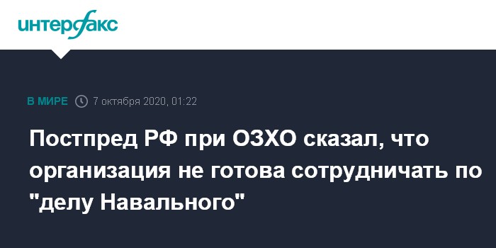 Москва. 7 октября. INTERFAX.RU - В Москве не видят готовности ОЗХО к сотрудничеству по "делу Навального", заявил постпред РФ при организации Александр Шульгин на заседании исполнительного совета ОЗХО.