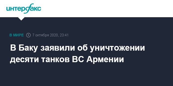 Москва. 7 октября. INTERFAX.RU - Подразделения азербайджанской армии 7 октября в ходе боев в различных направлениях фронта уничтожили до десяти танков Вооруженных сил (ВС) Армении, сообщает министерство обороны Азербайджана.
