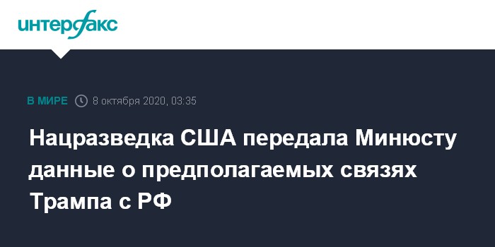 Москва. 8 октября. INTERFAX.RU -Директор Национальной разведки США Джон Рэтклифф одобрил передачу в Министерство юстиции документов, связанных с расследованием приписываемых президенту США Дональду Трампу связей с Россией.
