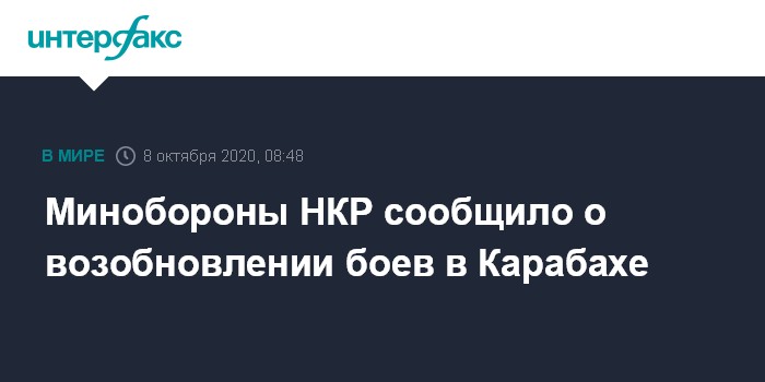 Москва. 8 октября. INTERFAX.RU - В зоне карабахского конфликта утром в четверг возобновились бои на южном и северном направлениях, заявило Минобороны непризнанной Нагорно-Карабахской республики (НКР).