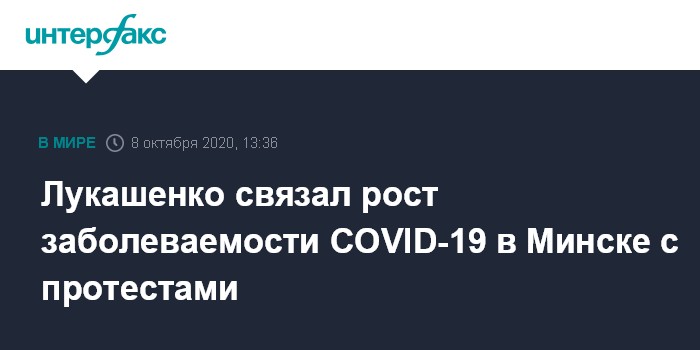 Москва. 8 октября. INTERFAX.RU - Президент Белоруссии Александр Лукашенко связывает рост заболеваемости коронавирусом в Минске с уличными протестами по воскресеньям.