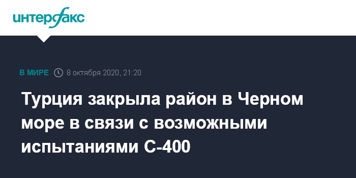Москва. 8 октября. INTERFAX.RU - На фоне сообщений о планируемых испытаниях приобретенных у России противоракетных комплексов С-400 турецкие власти закрыли район в Черном море вблизи города Синоп с 13 по 16 октября, следует из международного предупреждения для мореплавателей, распространенного в четверг морской администрацией страны.