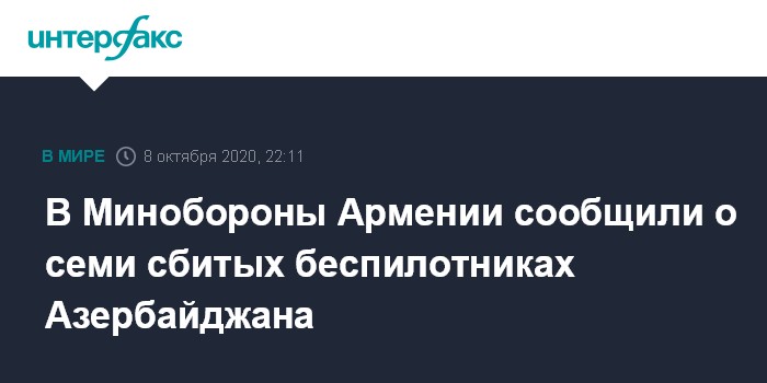 Москва. 8 октября. INTERFAX.RU - Семь беспилотников вооруженных сил Азербайджана сбиты над территорией Армении в четверг, сообщила пресс-секретарь Минобороны Армении Шушан Степанян.