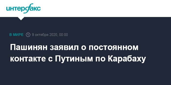 Москва. 8 октября. INTERFAX.RU - Премьер-министр Армении Никол Пашинян заявил о постоянном контакте с президентом России Владимиром Путиным по вопросу ситуации в Карабахе.