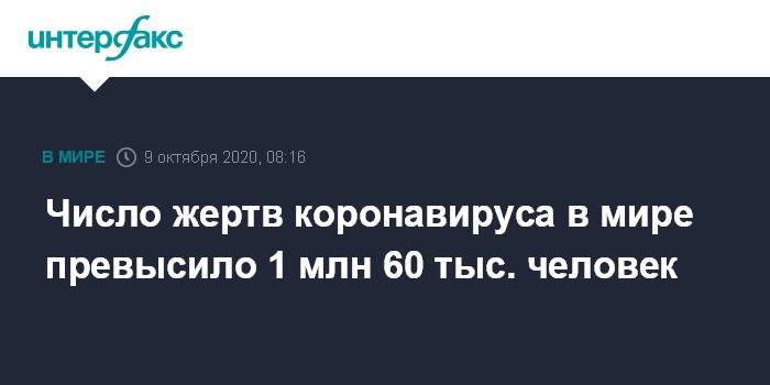 По его данным, во всем мире число жертв связанных с вирусом заболеваний выросло до 1 060 913 против 1 054 712 на утро четверга, 8 октября, излечились более 25,3 млн.