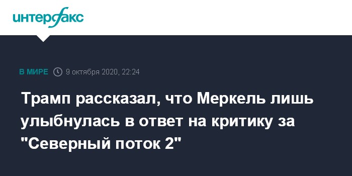 Москва. 9 октября. INTERFAX.RU - Президент США Дональд Трамп заявил, что в свое время канцлер ФРГ Ангела Меркель не стала вдаваться с ним в обсуждения, когда он раскритиковал ее за одобрение проекта газопровода "Северный поток 2".