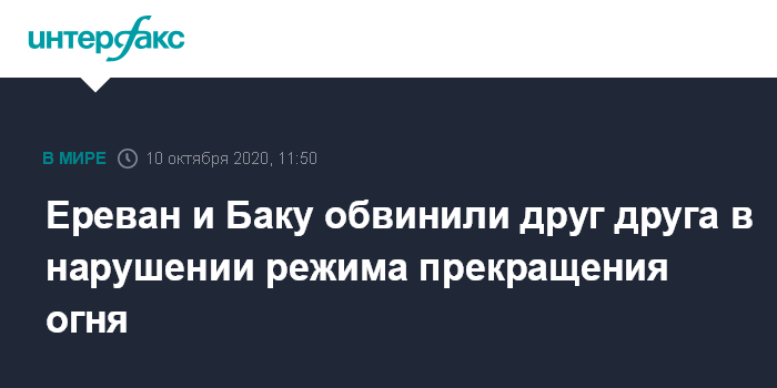 Москва. 10 октября. INTERFAX.RU - Армения и Азербайджан обвиняют друг друга в нарушении режима прекращения огня, вступившего в силу менее часа назад.