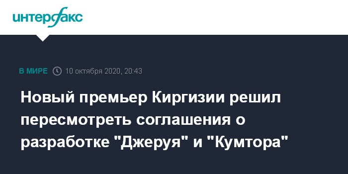 Москва. 10 октября. INTERFAX.RU - Утвержденный в должности премьер-министра Киргизии Садыр Жапаров заявил о намерении пересмотреть соглашения о разработке золоторудных месторождений "Джеруй" и "Кумтор" для пополнения бюджета страны.