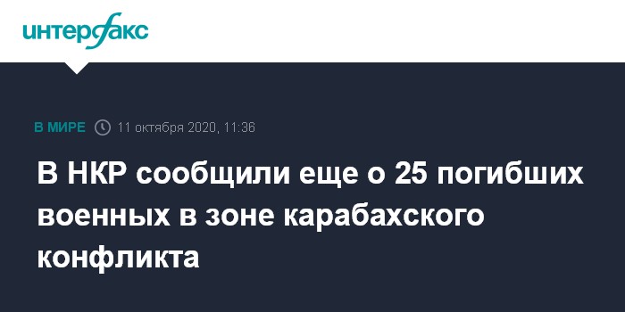 Москва. 11 октября. INTERFAX.RU - Министерство обороны непризнанной Нагорно-Карабахской Республики (НКР) сообщило в воскресенье еще о 25 погибших военных в боях с азербайджанскими подразделениями в зоне карабахского конфликта.