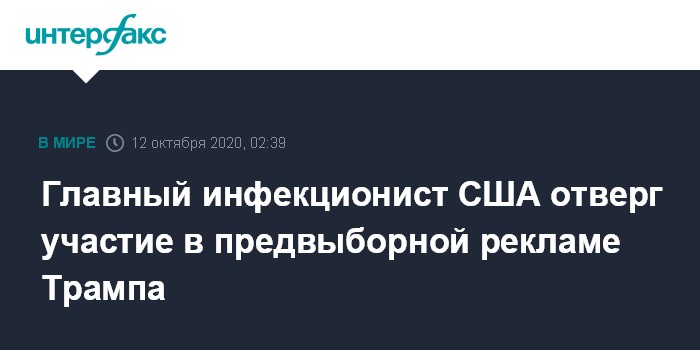 Москва. 12 октября. INTERFAX.RU - Главный инфекционист США, доктор Энтони Фаучи заявил, что не соглашался участвовать в предвыборной рекламе президента США Дональда Трампа и его слова были вырваны из контекста.