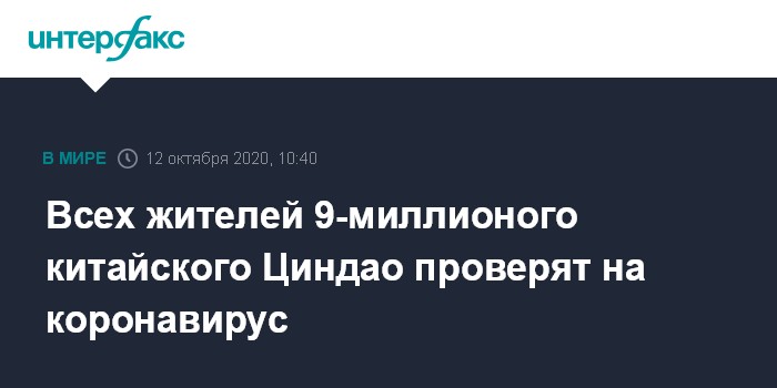Москва. 12 октября. INTERFAX.RU - Власти китайского города Циндао после обнаружения трех бессимптомных случаев заражения коронавирусом планируют протестировать на COVID-19 весь город, в котором живет более девяти миллионов человек.