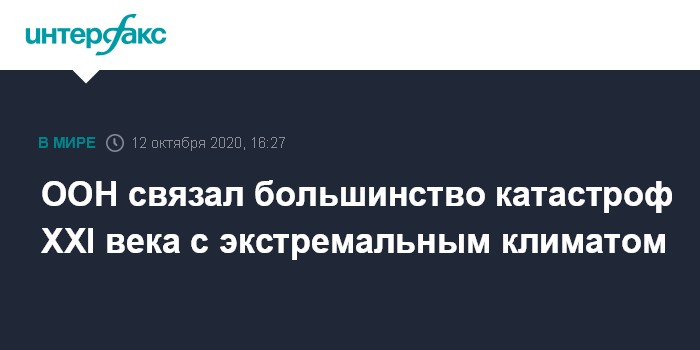 Москва. 12 октября. INTERFAX.RU - Большинство катастроф в XXI веке связаны с экстремальными климатическими явлениями, говорится в докладе Управления ООН по вопросам уменьшения опасности бедствий, распространенном на его сайте.
