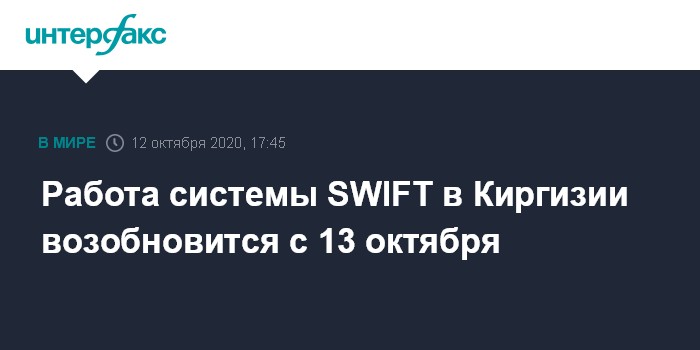 Москва. 12 октября. INTERFAX.RU - Работа системы SWIFT и альтернативных каналов связи в Киргизии возобновится с 13 октября, говорится в сообщении Нацбанка страны.