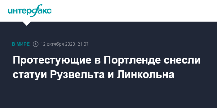 Москва. 12 октября. INTERFAX.RU - Протестующие в городе Портленде (штат Орегон, США) снесли статуи американских президентов Теодора Рузвельта и Авраама Линкольна во время манифестации, приуроченной ко Дню Колумба (день открытия Америки), который отмечается в понедельник.