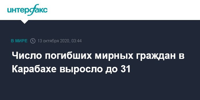 Москва. 13 октября. INTERFAX.RU - Число жертв среди мирного населения в Карабахе по состоянию на 12 октября возросло до 31, заявил омбудсмен непризнанной Нагорно-Карабахской республики (НКР) Артак Бегларян в понедельник.