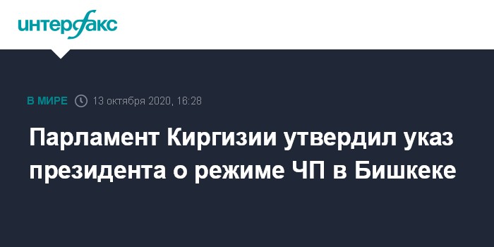 Москва. 13 октября. INTERFAX.RU - Парламент Киргизии утвердил указ президента страны Сооронбая Жээнбекова о введении режима чрезвычайного положения в столице республики, сообщает корреспондент "Интерфакса" из зала заседания во вторник.