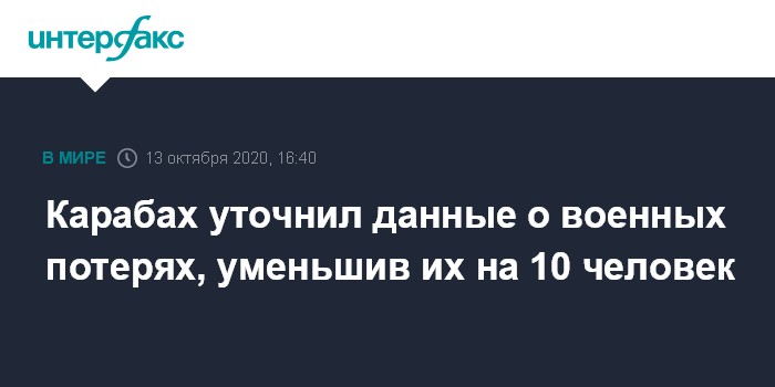 Москва. 13 октября. INTERFAX.RU - Министерство обороны непризнанной Нагорно-Карабахской Республики (НКР) во вторник уточнило данные о погибших военнослужащих в боях с азербайджанскими подразделениями в зоне карабахского конфликта.