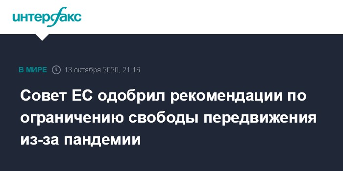 Москва. 13 октября. INTERFAX.RU - Совет ЕС по общим вопросам утвердил во вторник рекомендации по координации мер, ограничивающих свободу передвижения в Евросоюзе с целью борьбы против пандемии COVID-19.