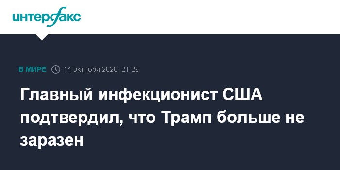 Москва. 14 октября. INTERFAX.RU - Главный американский инфекционист Энтони Фаучи проверил последние медицинские данные президента США Дональда Трампа и заключил, что глава государства не заразен коронавирусом COVID-19, сообщает телеканал CNN со ссылкой на заявление Национального института аллергии и инфекционных заболеваний.
