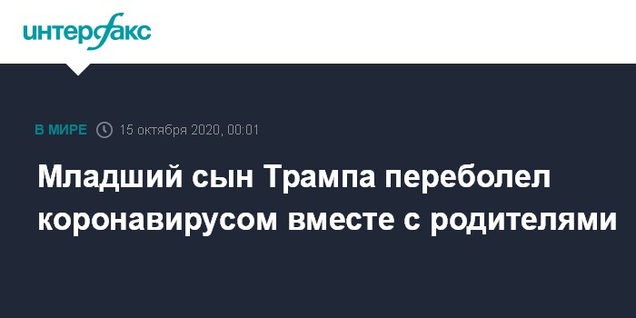 Москва. 15 октября. INTERFAX.RU - Сын президента США Дональда Трампа - 14-летний Бэррон - бессимптомно переболел коронавирусом COVID-19, сообщила в среду первая леди США Мелания Трамп.