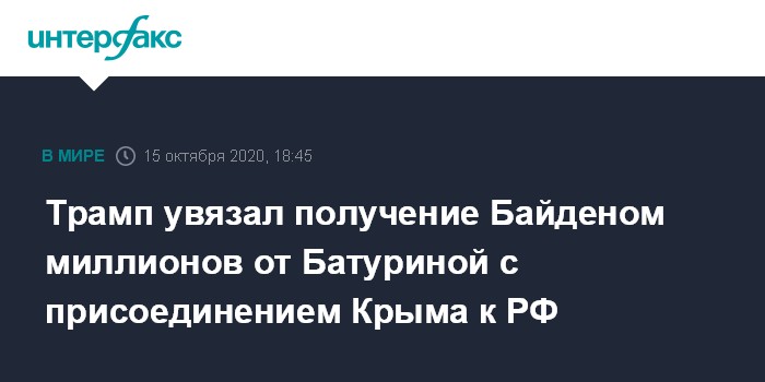 Москва. 15 октября. INTERFAX.RU - Президент США Дональд Трамп считает, что получение кандидатом в президенты США от Демократической партии Джо Байденом $3,5 млн от российской предпринимательницы Елены Батуриной имеет отношение к последующему присоединению Крыма к России.