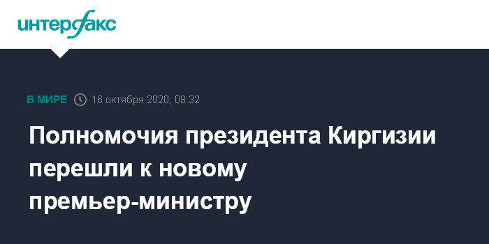 Москва. 16 октября. INTERFAX.RU - Полномочия президента Киргизии перешли к новому премьер-министру страны Садыру Жапарову, заявил депутат Омурбек Текебаев в пятницу на заседании киргизского парламента.