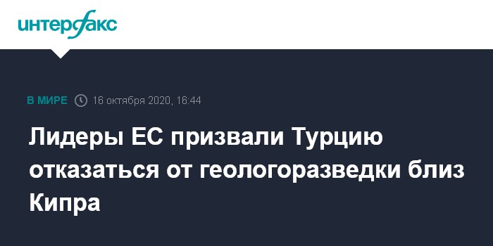 Москва. 16 октября. INTERFAX.RU - Лидеры ЕС по итогам двухдневного саммита призвали Турцию отказаться от геологоразведочной деятельности в Восточном Средиземноморье. Об этом говорится в совместном итоговом заявлении саммита глав государств и правительств стран ЕС в Брюсселе.