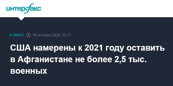Москва. 16 октября. INTERFAX.RU - В первые два месяца 2021 года численность американских войск в Афганистане сократится примерно до 2,5 тыс. человек, заявил в пятницу советник президента США по нацбезопасности Роберт О'Брайен.