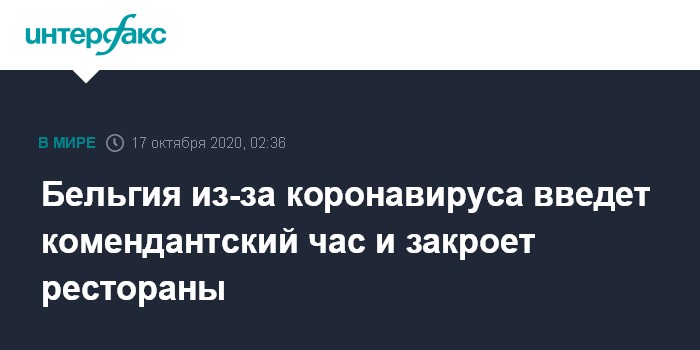 Москва. 17 октября. INTERFAX.RU - Бельгийский комитет по согласованию, который объединяет руководителей федеральных и региональных властей, в связи с ухудшением ситуации с COVID-19 в пятницу принял решение ввести комендантский час на всей территории страны.