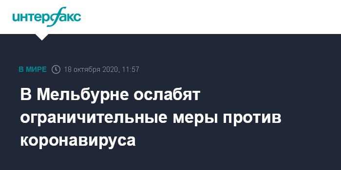 Москва. 18 октября. INTERFAX.RU - Власти Мельбурна - второго по размеру города Австралии с населением более 5 млн человек - в воскресенье объявили о частичном смягчении мер изоляции, введенных ранее из-за роста заболеваемости коронавирусом, однако отказались полностью отменять карантин, сообщают западные СМИ.