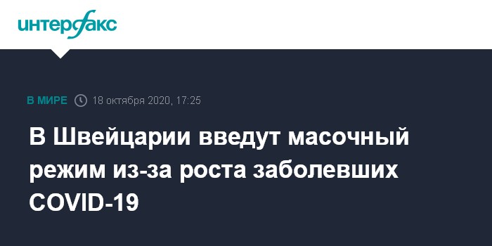 Москва. 18 октября. INTERFAX.RU - Власти Швейцарии приняли решение сделать обязательным ношение масок в закрытых помещениях и принять ряд других ограничительных мер из-за роста заболеваемости коронавирусом, сообщают в воскресенье французские СМИ.