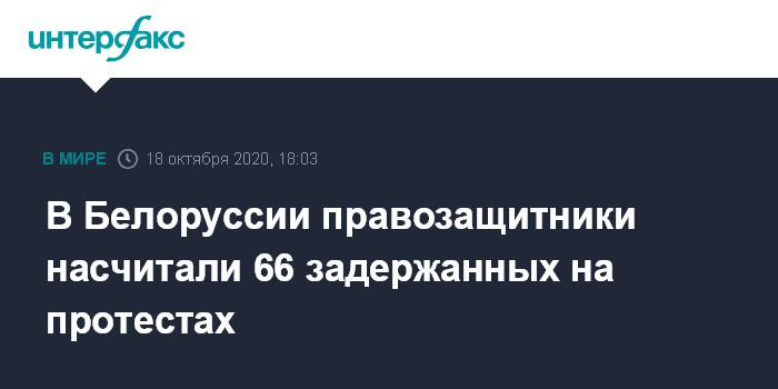 Москва. 18 октября. INTERFAX.RU - По данным не зарегистрированного в Белоруссии правозащитного центра "Весна", количество задержанных в воскресенье на несанкционированных акциях в республике составило 66 человек.