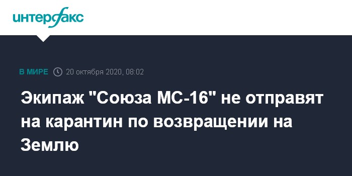 Москва. 20 октября. INTERFAX.RU - Космонавты, которые вернутся на Землю с Международной космической станции (МКС) 22 октября на пилотируемом корабле "Союз МС-16", не будут помещены на карантин в связи с распространением COVID-19, сообщили "Интерфаксу" в пресс-службе Центра подготовки космонавтов (ЦПК) им. Ю. А. Гагарина.