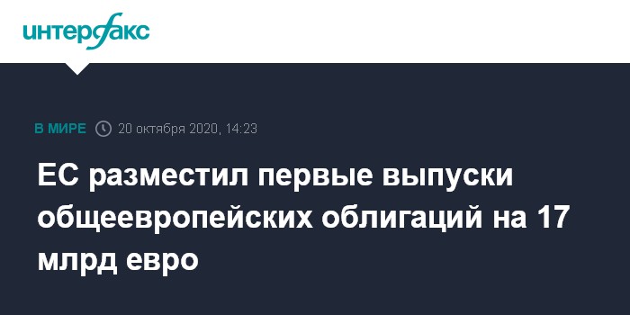 Москва. 20 октября. INTERFAX.RU - Европейский союз приступил к размещению общеевропейских облигаций в рамках программы SURE (Support to mitigate Unemployment Risks in an Emergency), являющейся ключевым инструментом стратегии ЕС по смягчению негативных последствий COVID-19 для экономики региона.