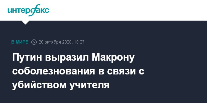 Москва. 20 октября. INTERFAX.RU - Президент России Владимир Путин в телефонном разговоре с президентом Франции Эммануэлем Макроном выразил соболезнования в связи с произошедшим в пригороде Парижа 16 октября терактом - варварским убийством французского учителя, сообщает пресс-служба Кремля.
