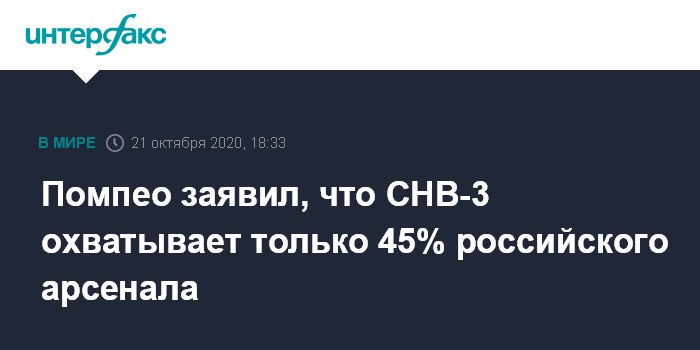 Москва. 21 октября. INTERFAX.RU - Госсекретарь США Майк Помпео в среду заявил, что Договор СНВ-3 в нынешнем виде очень неравномерно ограничивает американский и российский ядерные арсеналы.