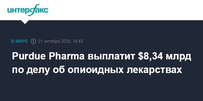 Москва. 21 октября. INTERFAX.RU - Американская фармкомпания Purdue Pharma LP, производитель обезболивающего препарата оксиконтин, пошла на сделку с Минюстом США, признав вину по трем уголовным обвинениям, предъявленным ей в рамках "опиоидного дела".