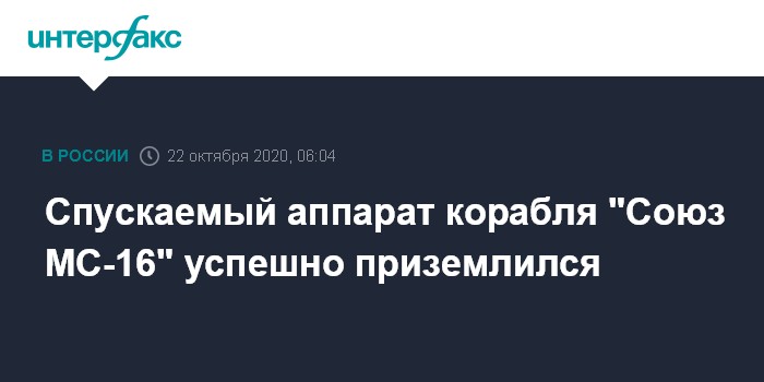 Москва. 22 октября. INTERFAX.RU - Спускаемый аппарат пилотируемого корабля "Союз МС-16", на борту которого с Международной космической станции (МКС) вернулись российские космонавты Анатолий Иванишин, Иван Вагнер и астронавт НАСА Кристофер Кэссиди, успешно приземлился в Казахстане.