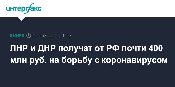 Москва. 22 октября. INTERFAX.RU - Самопровозглашенные Донецкая и Луганская народные республики получат от России медицинскую помощь для сдерживания коронавирусной инфекции на сумму почти в 400 млн рублей.