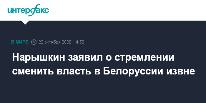 Москва. 22 октября. INTERFAX.RU - Директор Службы внешней разведки России Сергей Нарышкин назвал очевидным влияние на события в Белоруссии извне. Он заявил об этом в Минске, его цитирует "БелТА".