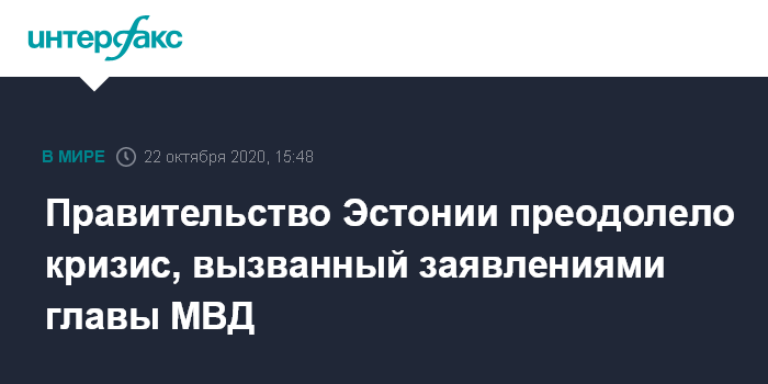 Москва. 22 октября. INTERFAX.RU - Премьер-министр Эстонии Юри Ратас заявил, что правительство преодолело кризис, возникший в минувшую пятницу после гомофобных высказываний в СМИ главы МВД Марта Хельме. Кабинет продолжит работу в прежнем составе.