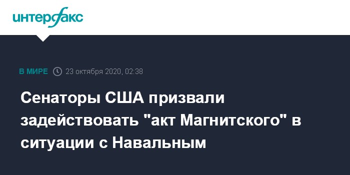 Москва. 23 октября. INTERFAX.RU - Группа американских сенаторов из обеих партий в письме госсекретарю США Майку Помпео и министру финансов Стивену Мнучину призвала установить виновных в отравлении российского оппозиционера Алексея Навального и ввести антироссийские санкции.