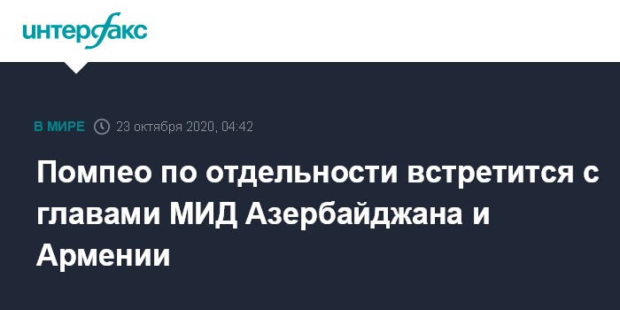 23 октября в 9:30 по местному времени (16:30 мск) Помпео проведет переговоры в Госдепартаменте с министром иностранных дел Азербайджана Джейхуном Байрамовым. Встреча с главой МИД Армении Зограбом Мнацаканяном состоится в тот же день в 10:30 (17:30 по мск).