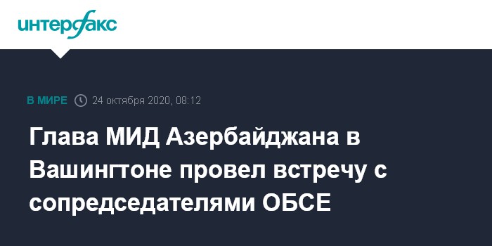Москва. 24 октября. INTERFAX.RU - Министр иностранных дел Азербайджана Джейхун Байрамов 23 октября в рамках визита в Вашингтон провел встречу с сопредседателями Минской группы ОБСЕ, сообщает пресс-служба МИД.