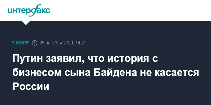 Москва. 25 октября. INTERFAX.RU - Президент РФ Владимир Путин заявил, что ему неизвестно о наличии у сына кандидата в президенты США Джо Байдена криминальных бизнес-интересов на Украине, но в любом случае этот вопрос не касается России.