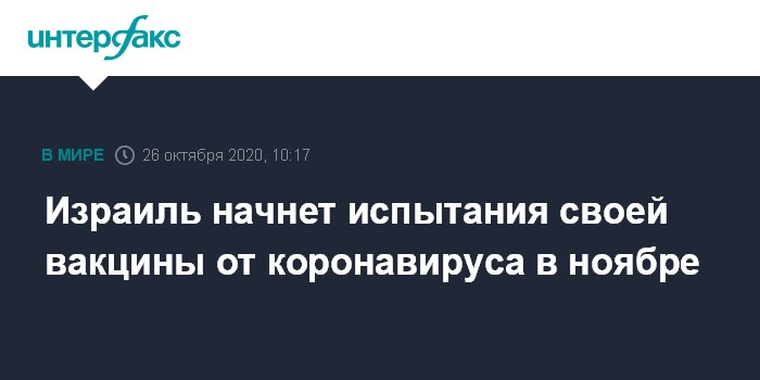 Москва. 26 октября. INTERFAX.RU - В Израиле Институт биологических исследований с 1 ноября начнет испытания собственной вакцины от COVID-19, сообщило Минобороны страны. Об этом пишет Times of Israel.