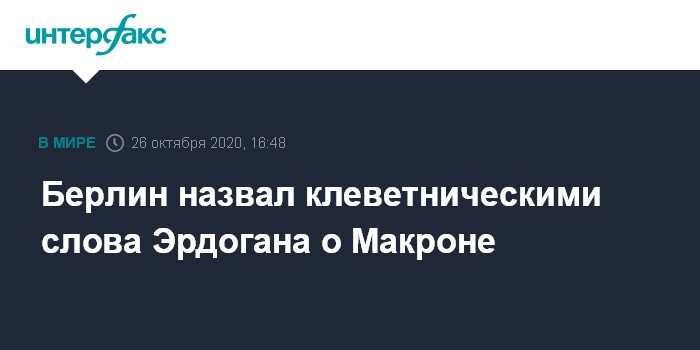Москва. 26 октября. INTERFAX.RU - В правительстве Германии считают клеветническими и совершенно неприемлемыми заявления президента Турции Реджепа Тайипа Эрдогана о президенте Франции Эммануэле Макроне, заявил представитель кабинета министров ФРГ Штеффен Зайберт.